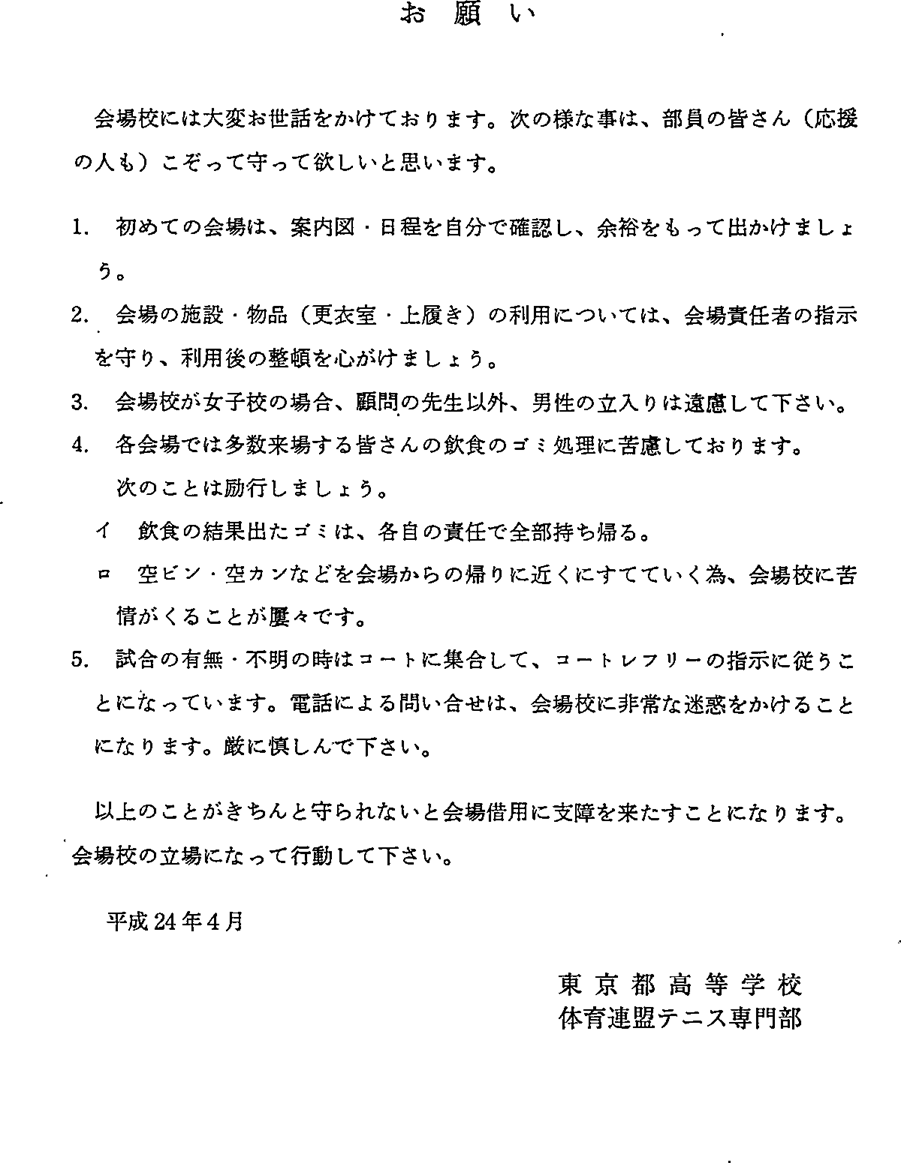 このサイトは、平成24年(2012年)4月に発刊された「東京都高等学校体育連盟テニス専門部 会場校案内」をデジタル化したものです。